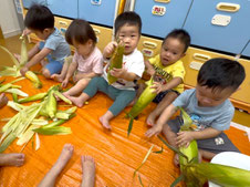 大きな葉っぱと モジャモジャの毛☆ 力いっぱい むいたよ!! とれたてコーンは とっても甘くて 美味しかったよ!